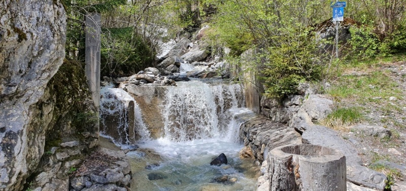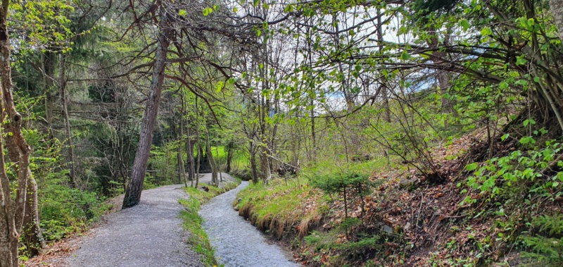 Das Ende der Suone Neuf und der Beginn der Suone von Varen liegen genau an der Sprachgrenze des Wallis, die hier geografisch durch die Raspille markiert wird. Der Weg führt weiter durch lichten Mischwald aus Laub- und Nadelbäumen.